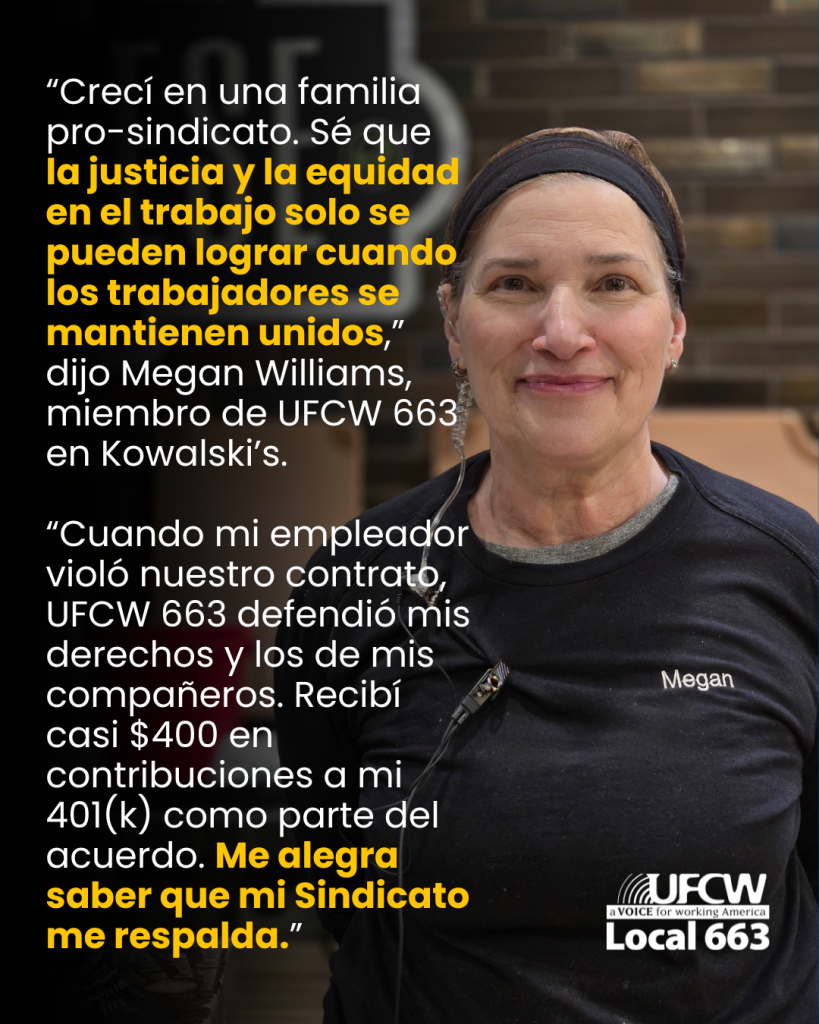 UFCW 663 tomó acción — presentamos una queja (grievance) y ganamos un acuerdo. Como resultado, 17 miembros en Kowalski’s recibirán un total combinado de $5,063 en contribuciones adicionales a su 401(k).