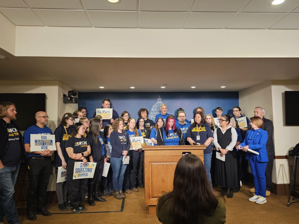 UFCW 663 member and Cub Foods E-commerce employee Hayley spoke at the state capitol with other members of UFCW to share why surveillance pricing and electronic shelf labels stand in the way of working families thriving.